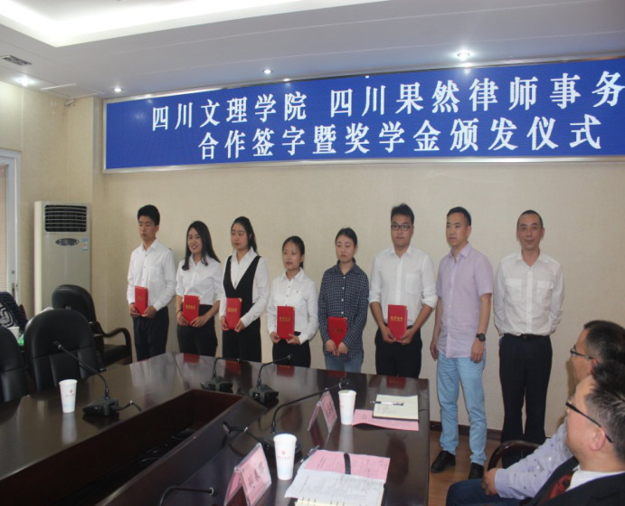 接下来,邓杰处长和田金陇主任分别代表双方签署校企合作协议。王成端书记代表学校向四川果然律师事务所授“betway西汉姆联教育教学实践基地”牌匾。然后,邓杰处长宣读了2017-2018学年“果然奖学金”获奖名单,李魏、王顺平、何秀霞、王潇、任静欢、王川江等6名同学分别获得一二三等奖学金。朱世健和周健主任代表果然律师事务所向获奖学生颁奖。之后,李魏代表获奖学生发言,他首先对学校和四川果然律师事务所的培养与关心表示由衷感谢,他介绍了自己在文理学院的成长经历以及在律师事务所见习的收获,并誓言将荣誉化作动力,今后更加努力地学习和工作。