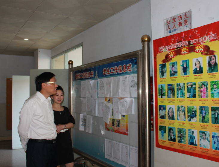 5月15日上午,校长王成端率教务处、校办、评估处督导专家一行来学院检查指导中期教学工作。王校长在学院党政领导的陪同下,查看了学院宣传展板、走访了办公场所、图书资料室、教研室,详细了解了学院的办公条件。