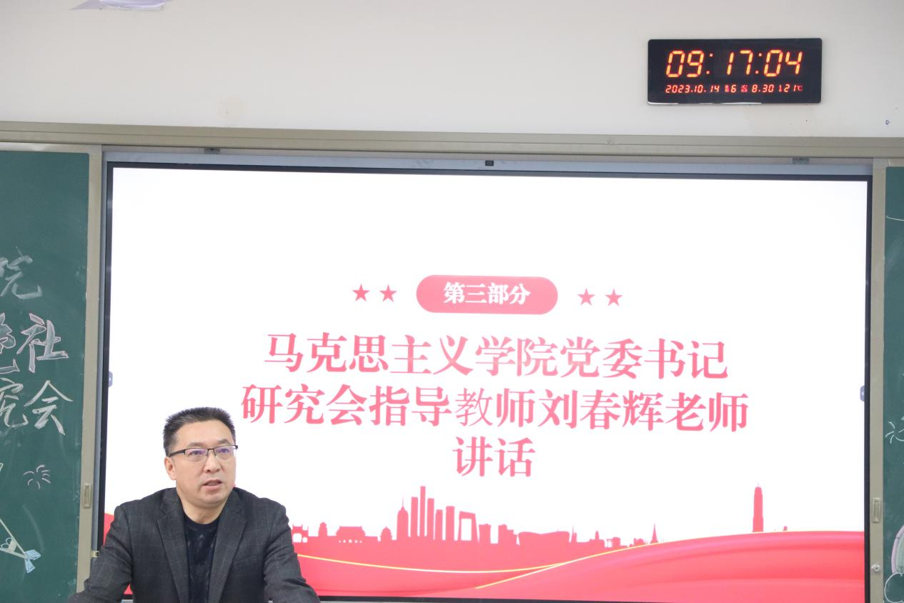 会长发言完毕后,学院党委书记、研究会指导老师刘春辉作了讲话。他指出,一个社团的成功不只在老师,更重要的是社团的会员们,只有不断地吸收新鲜的血液,社团才会更好地发展。他强调,进入研究会以后,要不断加强对中国特色社会主义理论的学习与研究,树立坚定的马克思主义信仰,并要将理论与实践相结合,成为一个合格的社会主义建设者与接班人。