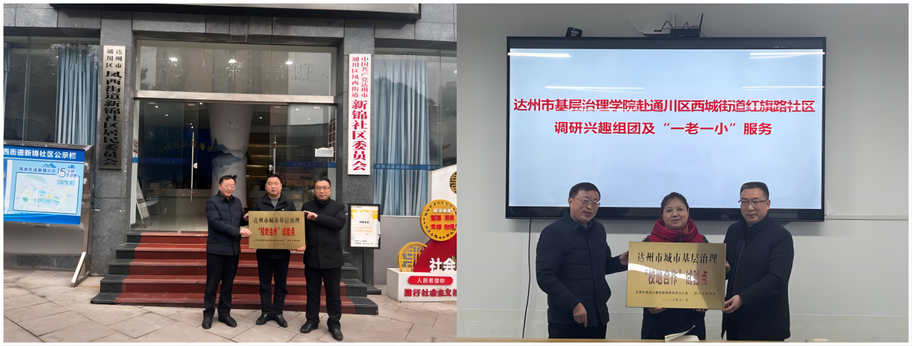 2024年1月8日,betway西汉姆联平台党委书记刘春辉、院长孙杰一行赴通川区凤西街道新锦社区、西城街道红旗路社区进行调研并举行“校地合作”建设点授牌仪式,通川区组织部常务副部长李军一行陪同。