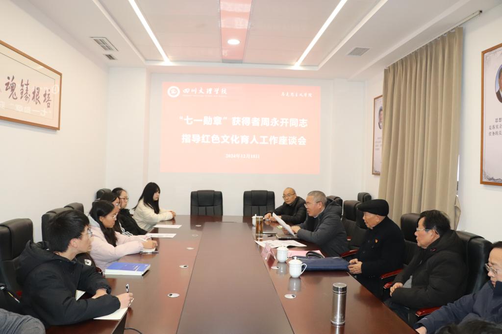 12月16日下午,七一勋章”获得者、全国优秀共产党员、原达县地委副书记、地区纪委书记周永开同志莅临我院指导红色文化育人工作并召开座谈会。会议由学校党委副书记徐晓宗主持。