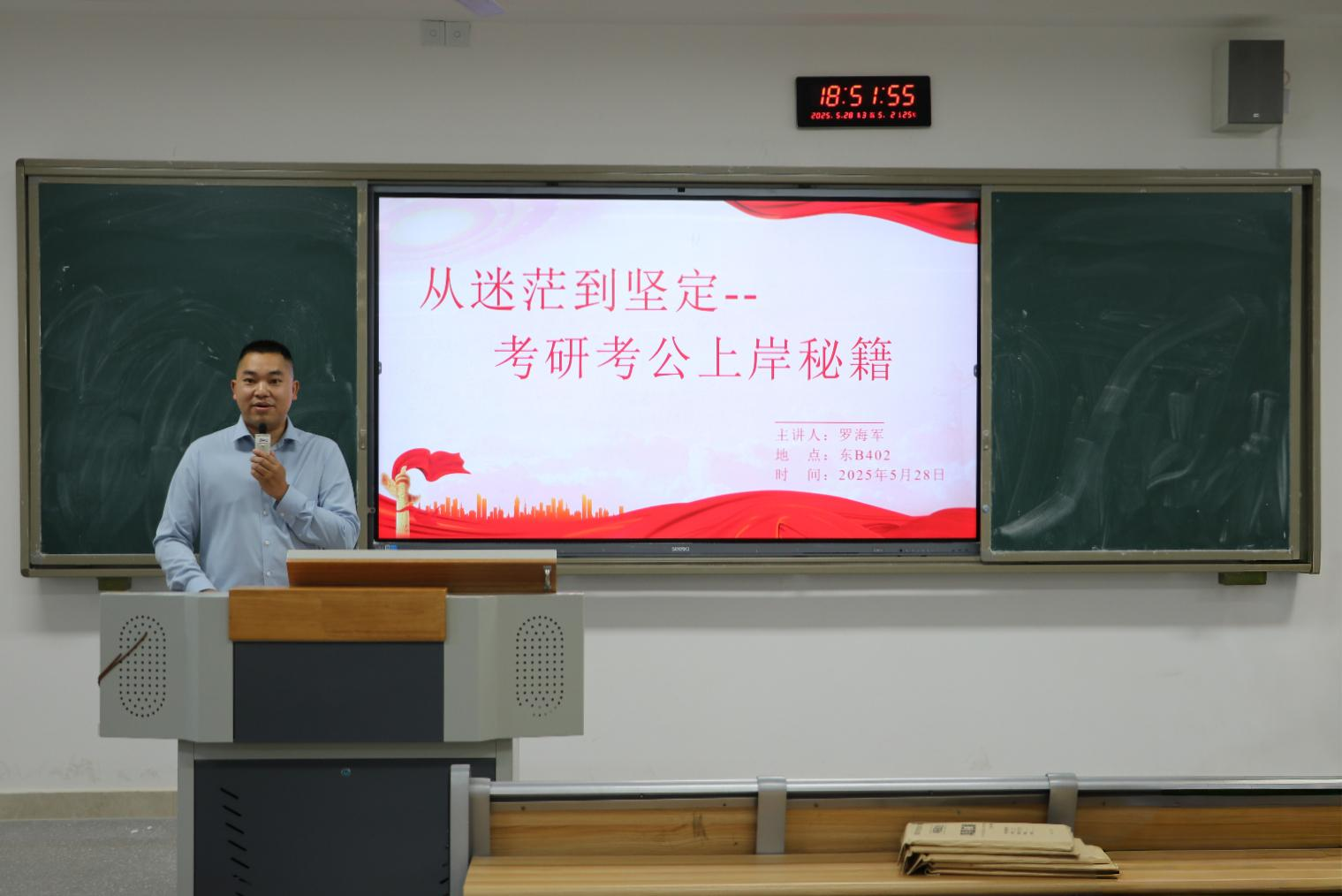 为帮助学生明晰升学与就业方向,提升备考效率,我院于5月28日在莲湖东区B402举办以“从迷茫到坚定—考研考公上岸秘籍”为主题的考研考公辅导讲座,本次活动聚焦考研、考公、大热点领域,我院孟威老师主持,罗海军博士主讲,我院大三全体同学到场聆听。