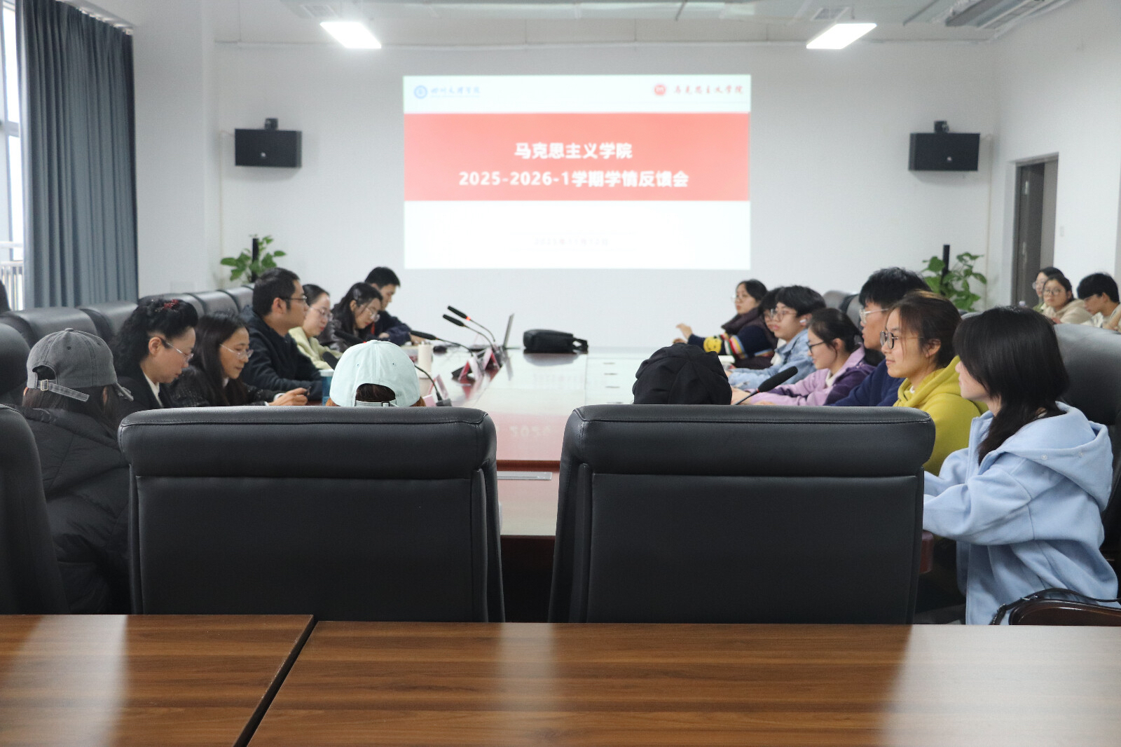 为精准把握思政课教学实效,及时回应学生学习诉求,持续提升课程育人质量,11月12日,马克思主义学院2025-2026-1学期思政课学情反馈会在莲湖校区东区C108会议室顺利召开。学院副书记周春滟、思想政治教育教研室主任曹红梅、马克思主义基本原理教研室主任文茂群、习近平新时代中国特色社会主义思想概论教研室主任孟威、思想道德与法治教研室主任王敏、教科办副主任杨建霞及青年教师王振等老师、各二级学院学生代表参会。副院长何先成主持。