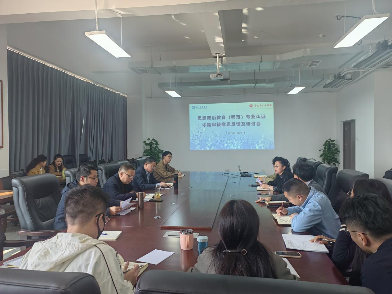 3月26日,学院在东C108会议室举行了思想政治教育(师范)专业认证中期审核意见反馈及研讨会。本次会议由思政教研室主任曹红梅老师主持,马克思主义主义学院党委书记刘春辉、院长孙杰、副院长何先成出席,思政专业全体任课教师参加了此次会议。