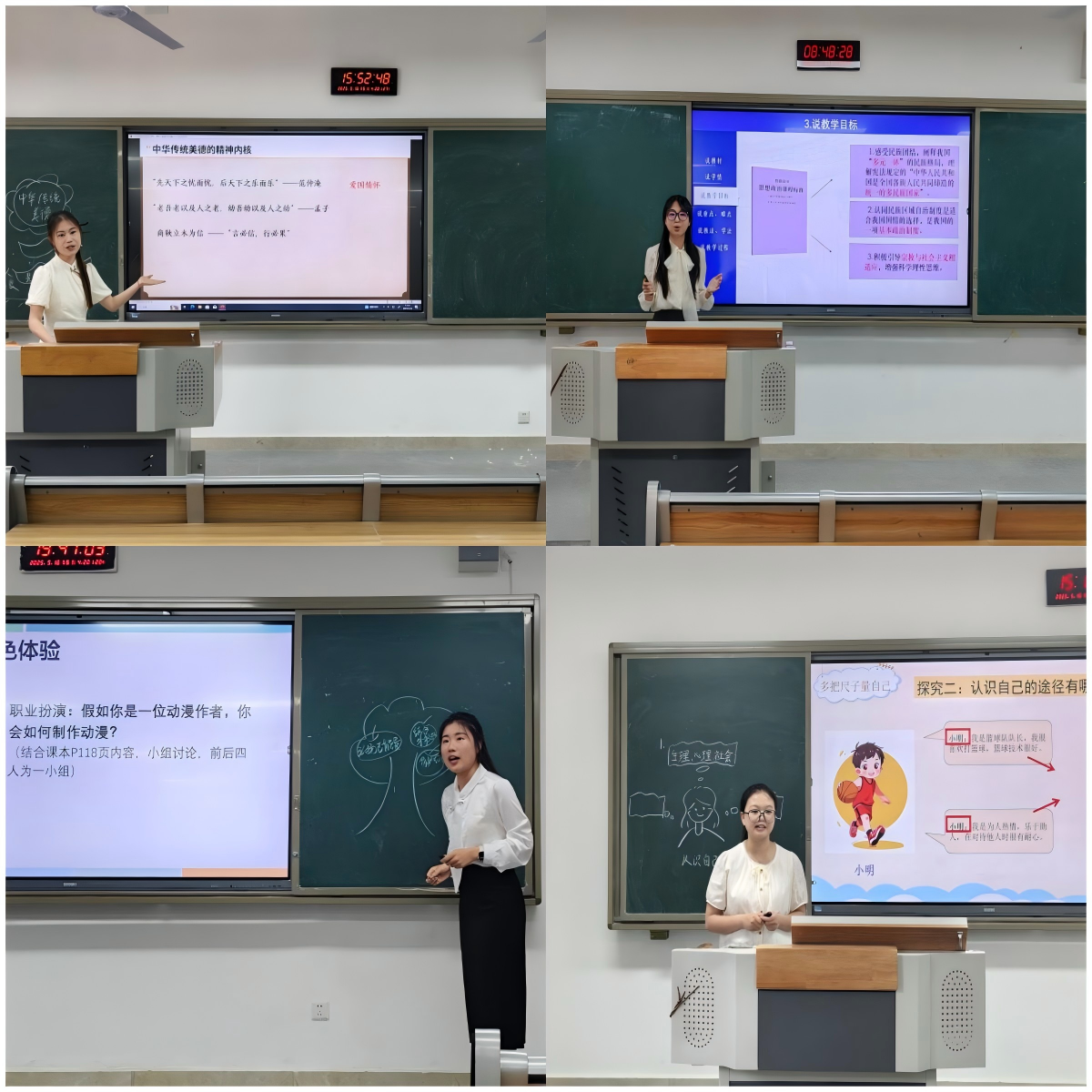 比赛过程中,各参赛选手根据教学设计方案,围绕所选教学主题进行限时3分钟的说课和10分钟的模拟课堂教学展示。选手们在教学演示中教态自然大方,教学行为规范严谨。他们准确把握中学政治课程标准要求,科学设计教学目标,教学环节层层递进、脉络清晰,板书设计巧妙呈现知识体系,展示了我院师范生扎实的专业功底。