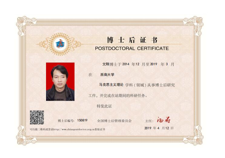 近日,从西南大学获悉,我院文翔教授于2014年12月-2019年3月在西南大学马克思主义理论学科(领域)从事博士后研究工作,完成在站期间的科研任务,日前顺利出站。