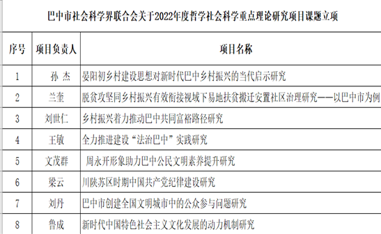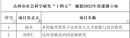 近日,达州市社科联、巴中市社科联发布了达州市、巴中市社会科学研究“十四五”规划2022年度课题立项通报。据统计,betway西汉姆联平台教师共立项课题10项,具体立项名单请参见下表。请获准立项的老师认真开展课题研究工作,确保课题按时高质量完成,为地方经济社会发展提供智力支撑。