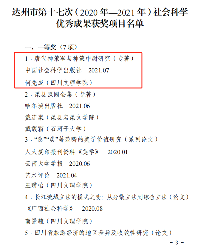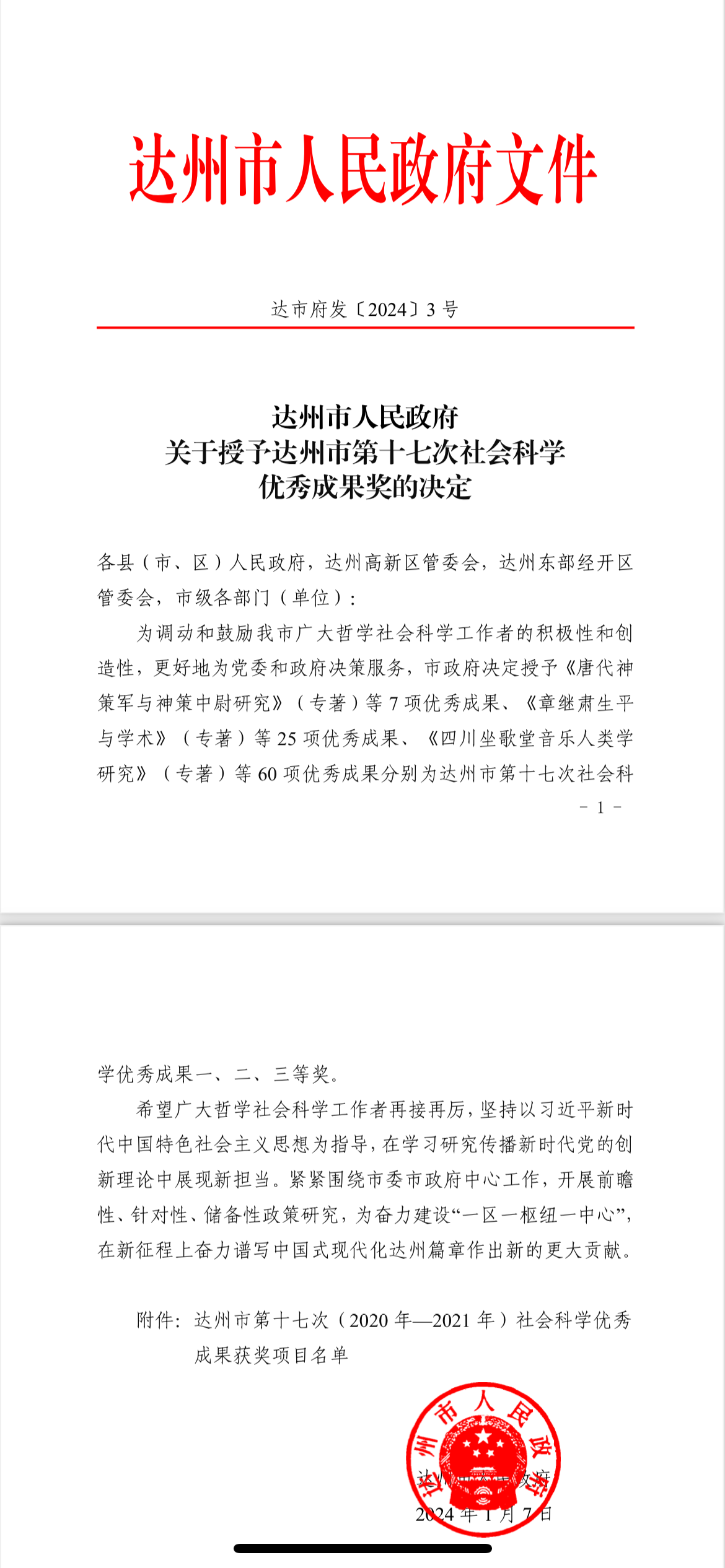 学院院长孙杰专著《探析新时代乡村振兴战略实施路径及策略》与学院副院长何先成专著《唐代神策军与神策中尉研究》荣获达州市第十七次社会科学优秀成果奖一等奖。张善喜老师论文《习近平劳动观的逻辑诠释》荣获达州市第十七次社会科学优秀成果奖三等奖。