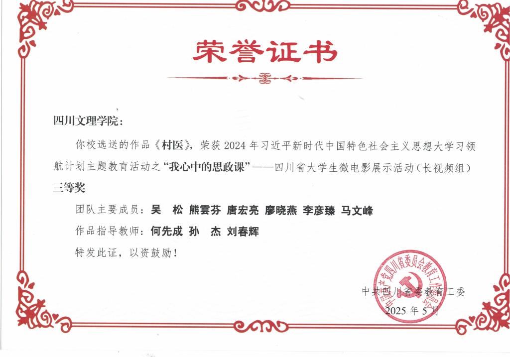 在“我心中的思政课”四川省大学生微电影展示活动(长视频组) 中,我院选送的作品《村医》获三等奖。《村医》由吴松、熊雲芬、唐宏亮、廖晓燕、李彦臻、马文峰等同学组成创作团队,在何先成、孙杰、刘春辉三位教师的悉心指导下完成。影片聚焦基层医疗工作者扎根乡村、守护健康的感人事迹,以细腻的镜头语言和真实的故事呈现,生动诠释了基层工作者的使命与担当,将思政教育元素融入影像艺术之中。
